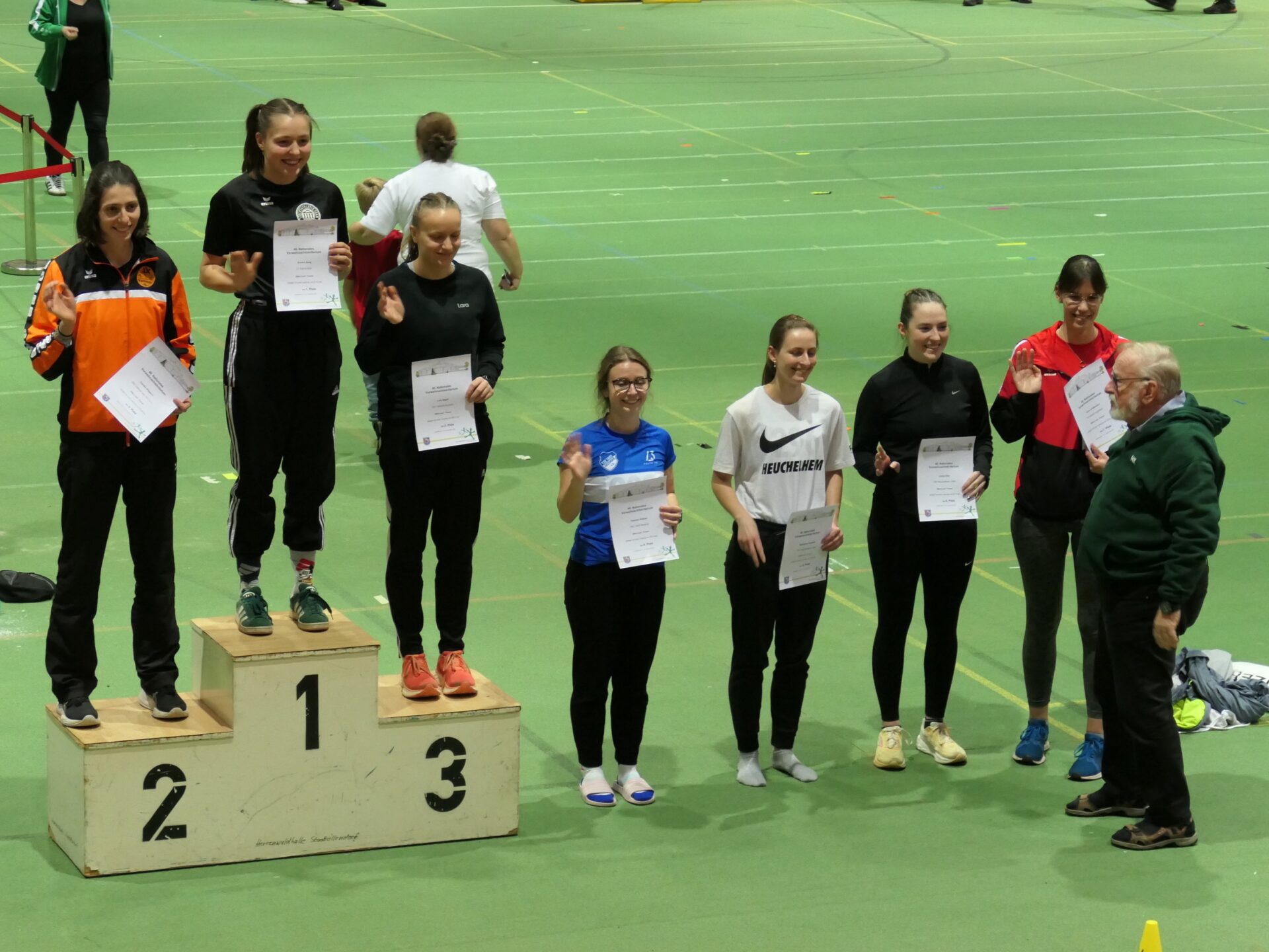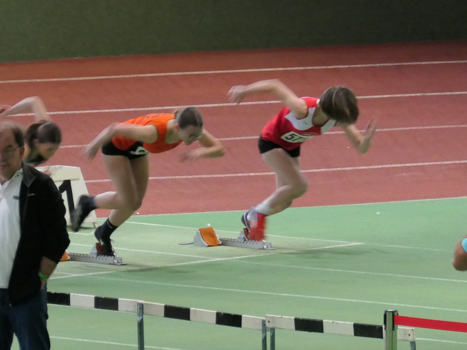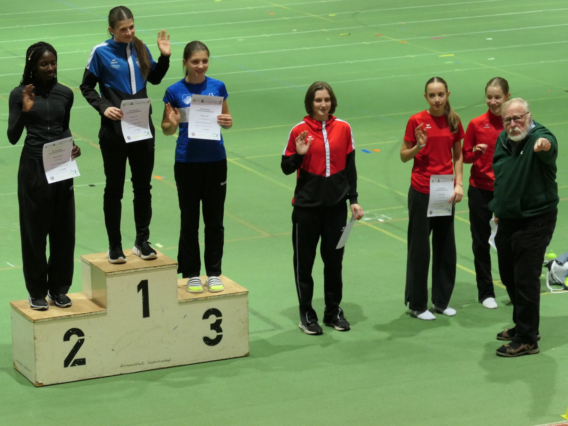 Deutlich besser lief es dagegen in den Sprintdisziplinen. Über 60m konnte Mareike eine neue Bestleistung für sich verbuchen. Sie sprintete in 8,44 sec über die Ziellinie. Zum Abschluss eines langen Wettkampftages ging es für die beiden noch einmal über 200m in die Startblöcke. 200m, das heißt in der Halle über eine Runde mit überhöhten Kurven. Jana hatte in ihrem Lauf das Lospech, dass sie auf der engen Innenbahn laufen musste. Trotzdem sicherte sie sich mit 33,81s und Platz 7 noch einen Platz unter den besten 8, die bei der Siegerehrung zur Belohnung noch einmal einen Griff in die Ferrero Zugabekiste machen durften.