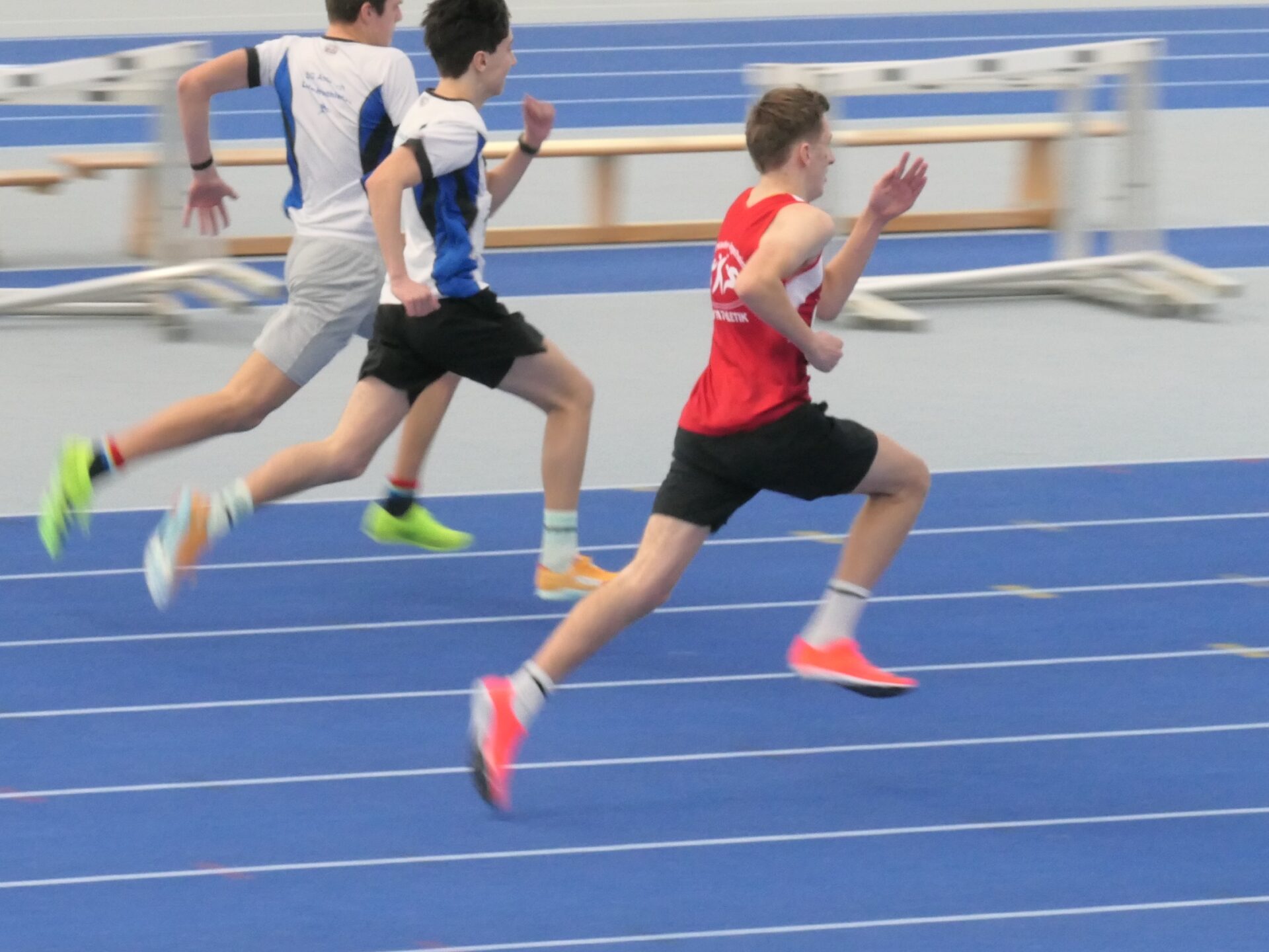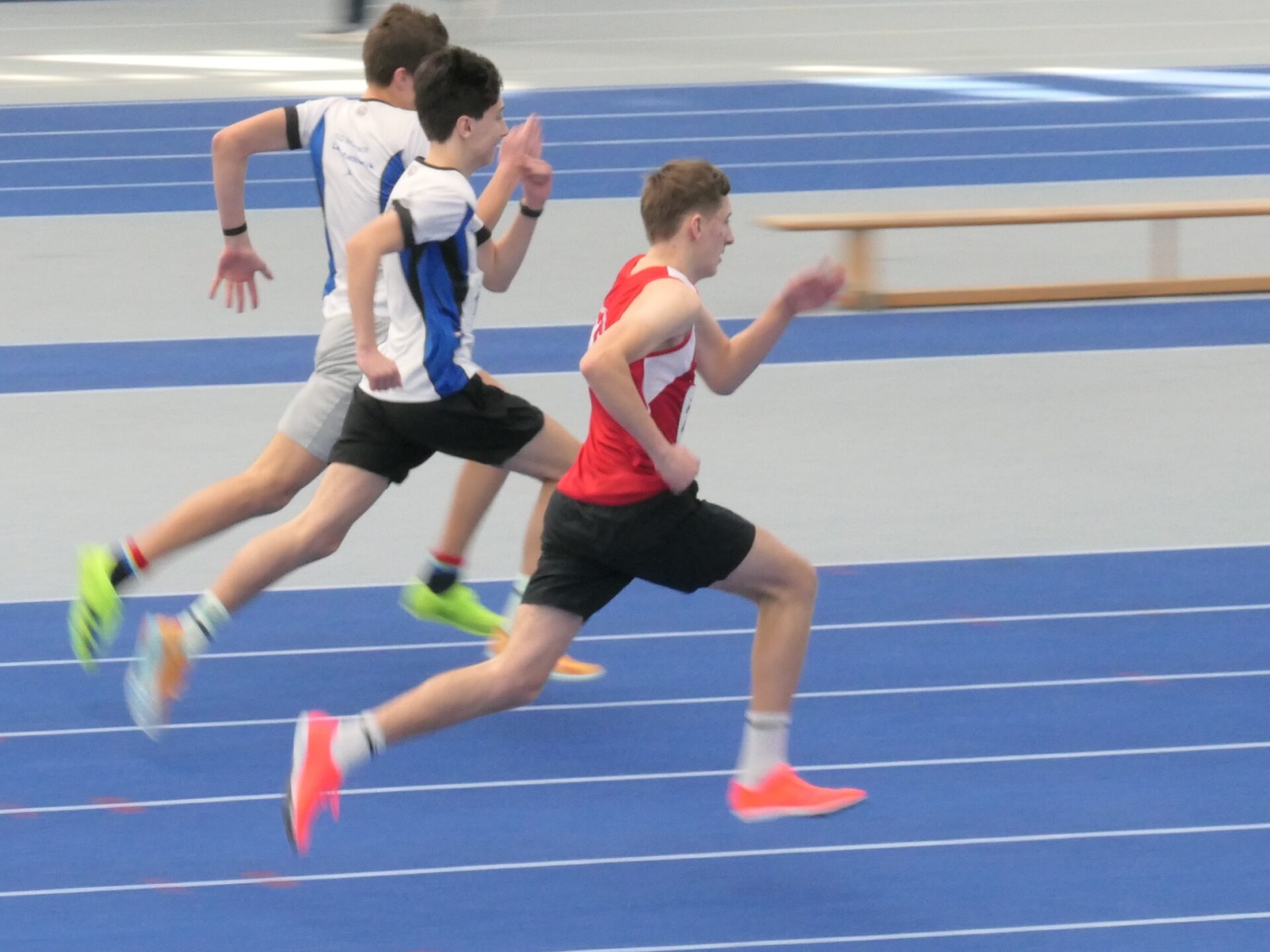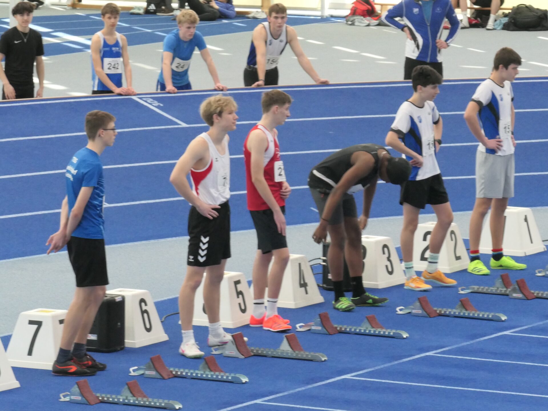Fast schon routiniert bereitete sich dann Mareike auf ihren Auftritt vor. Sie hatte ja schon ein paar Hallenauftritte hinter sich. Für sie galt es, eine neue persönliche Bestleistung aufzustellen. Mit 8,38 sec und der Qualifikation für den Endlauf gelang ihr das auf Anhieb. Und was niemand erwartete, im Endlauf konnte sie sich noch einmal steigern und mit 8,32 sec den 3. Platz für sich sichern. Danach ging es nach einer kurzen Pause zu der langen Sprintstrecke. In der Halle bedeuten die 200m eine komplette Runde zu sprinten. Mit der Erfahrung des ersten Hallensprints bereitet sich Maximilian auf seine Aufgabe vor. Gar nicht so einfach, schließlich sind die engen Hallenkurven leicht überhöht, man startet sozusagen auf einer Schrägen. Aber Maximilian meistere auch diese Aufgabe und kam in 27,42 sec ins Ziel.