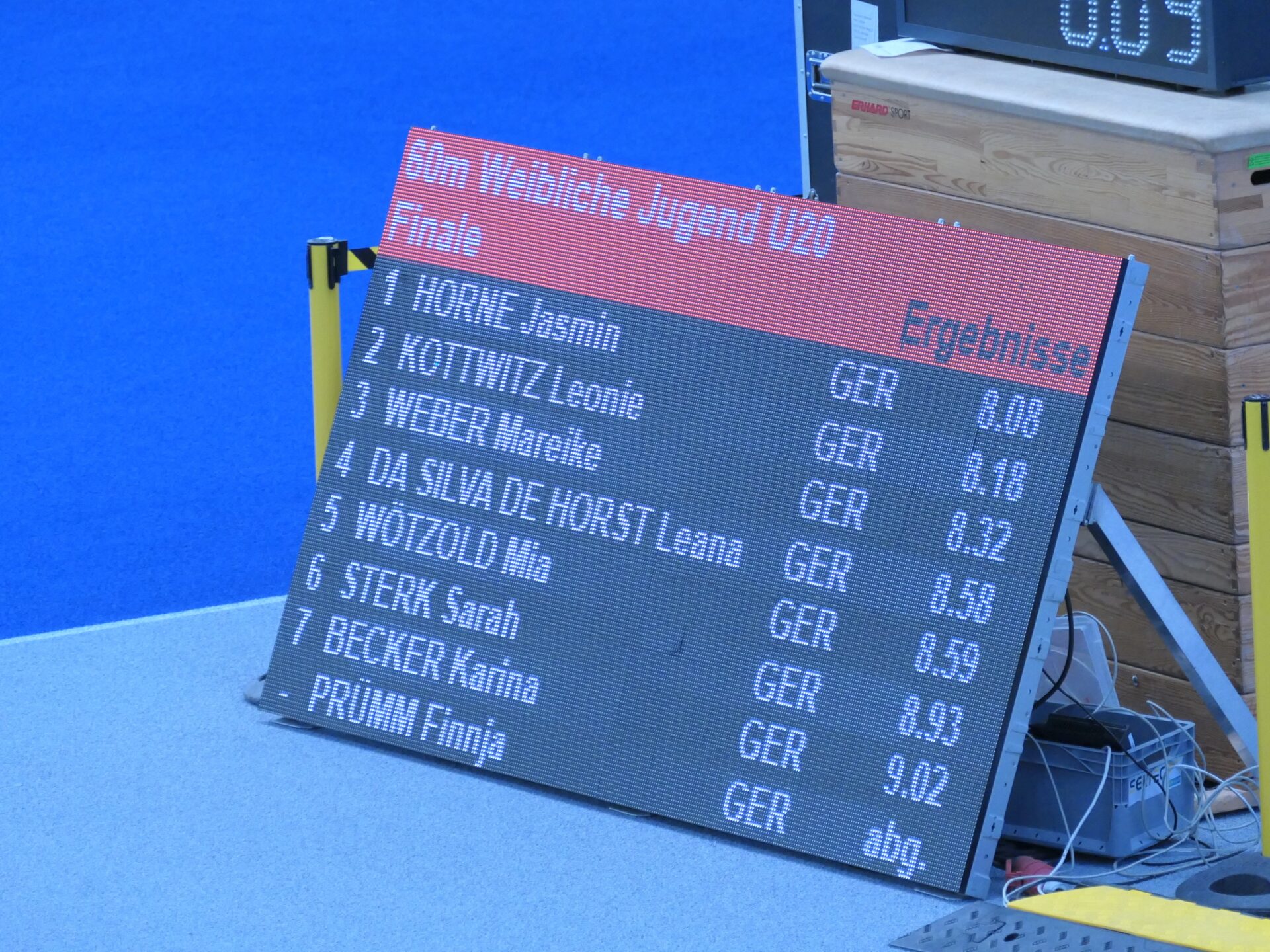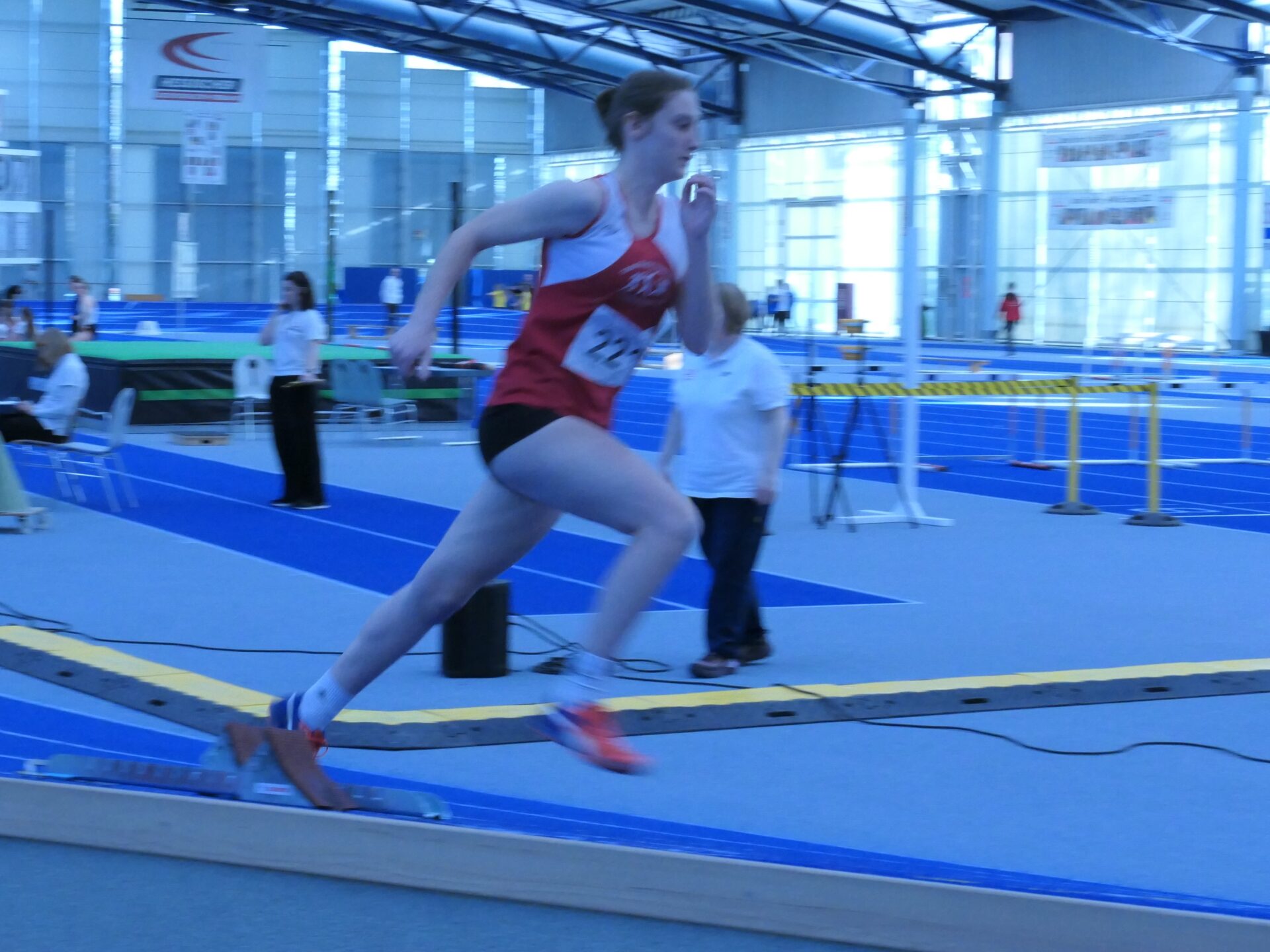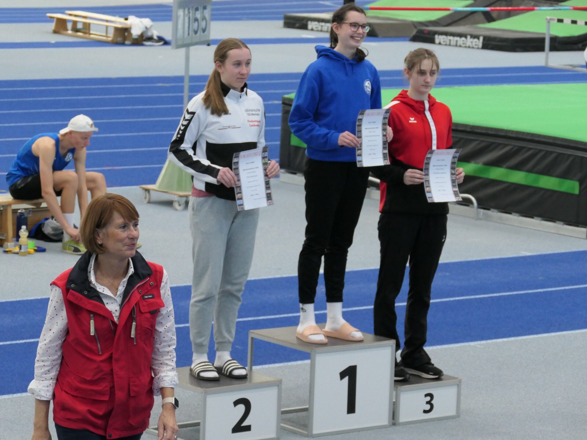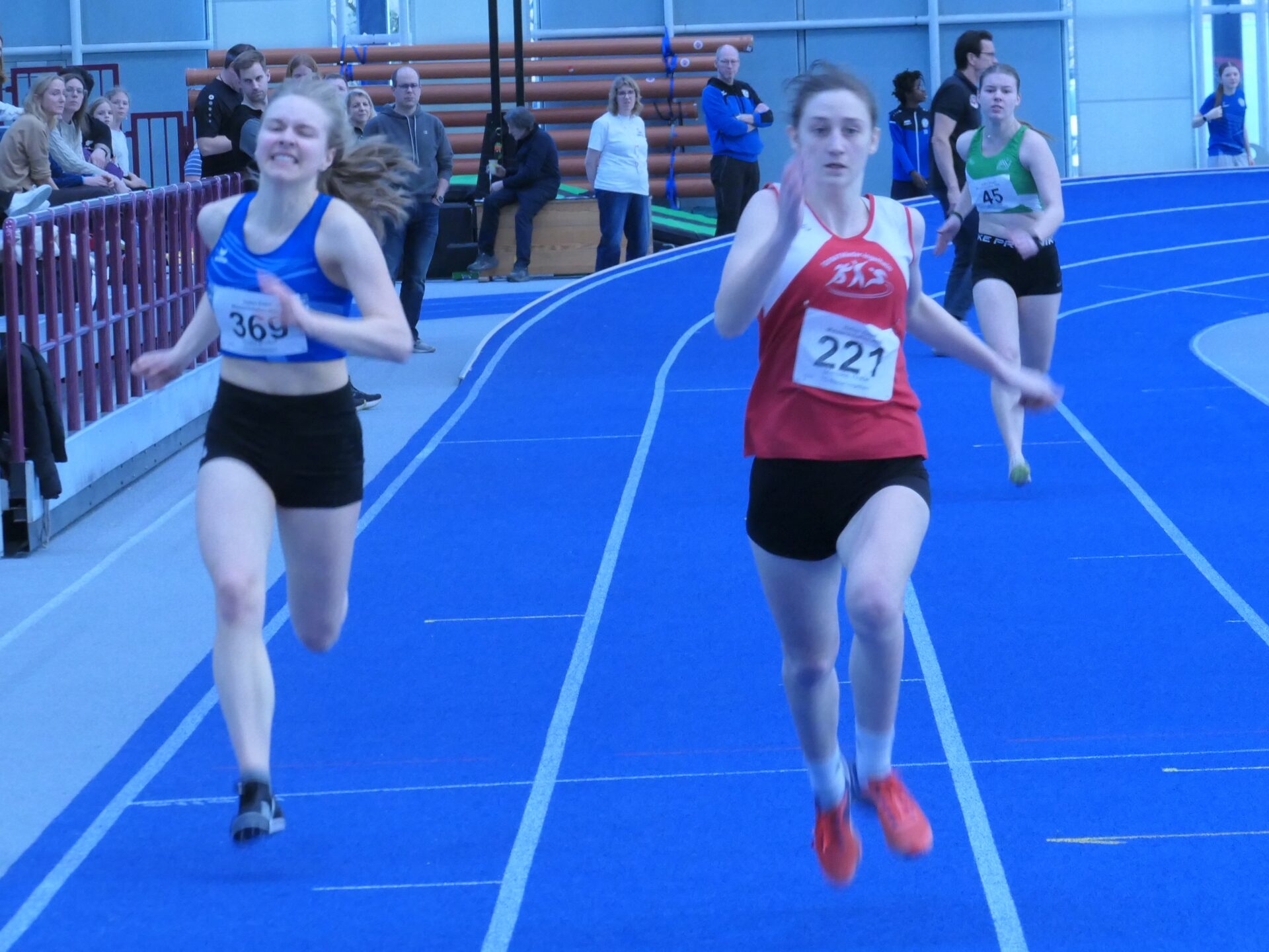 Fast schon routiniert bereitete sich dann Mareike auf ihren Auftritt vor. Sie hatte ja schon ein paar Hallenauftritte hinter sich. Für sie galt es, eine neue persönliche Bestleistung aufzustellen. Mit 8,38 sec und der Qualifikation für den Endlauf gelang ihr das auf Anhieb. Und was niemand erwartete, im Endlauf konnte sie sich noch einmal steigern und mit 8,32 sec den 3. Platz für sich sichern. Danach ging es nach einer kurzen Pause zu der langen Sprintstrecke. In der Halle bedeuten die 200m eine komplette Runde zu sprinten. Mit der Erfahrung des ersten Hallensprints bereitet sich Maximilian auf seine Aufgabe vor. Gar nicht so einfach, schließlich sind die engen Hallenkurven leicht überhöht, man startet sozusagen auf einer Schrägen. Aber Maximilian meistere auch diese Aufgabe und kam in 27,42 sec ins Ziel.