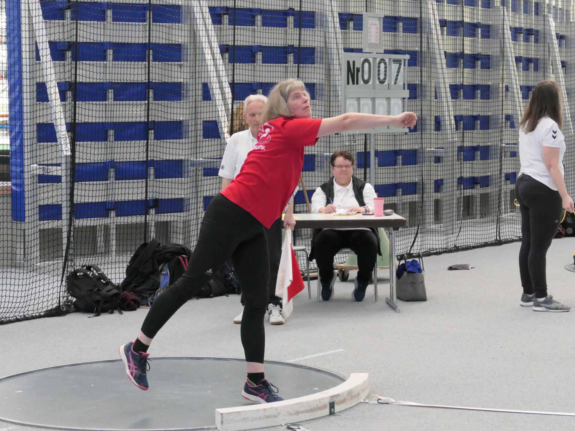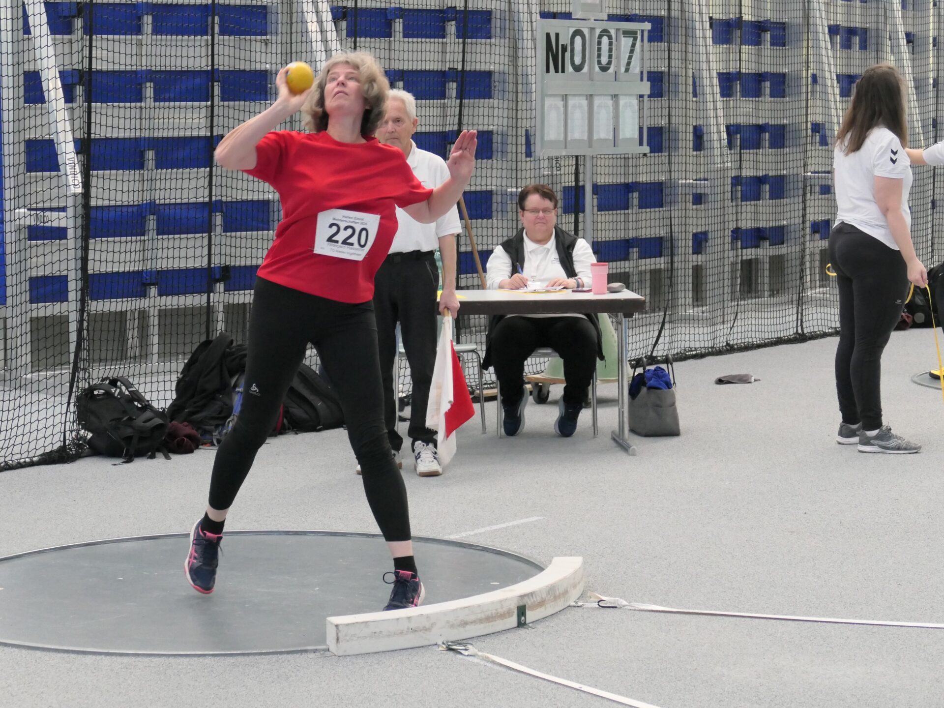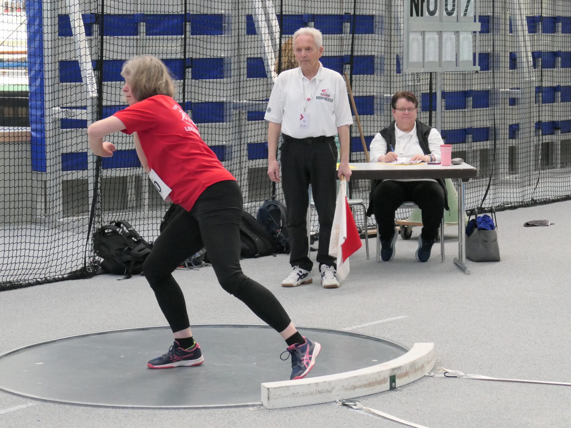 Für Hildegard war es seit einigen Jahren Pause ein Wiedersehen mit der Halle. Sie hatte sich für das Kugelstoßen entschieden und wollte in der W55-Klasse mit der 3kg-Kugel zum Start ins neue Wettkampfjahr auf jeden Fall gleich die 7-Marke knacken. Ein hoch gestecktes Ziel, schließlich kann bei uns in der Halle kein Techniktraining mit Kugel durchgeführt werden. Doch der erste Stoß mit 6,89m deutete schon an, dass es klappen könnte. Auch die nächsten beiden Stöße landeten knapp vor der 7m-Linie. Dann klappte es aber doch noch, die Kugel landete bei 7,03m – entsprechend groß war die Freude bei Athletin und Trainer.